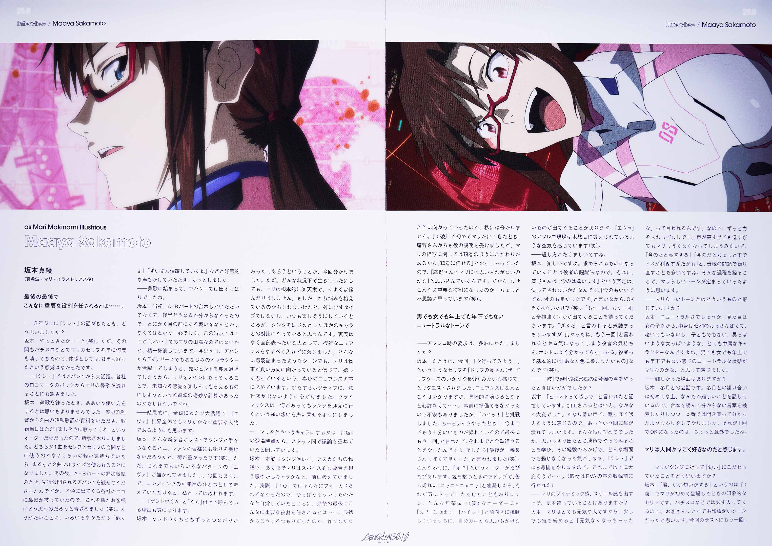 - ↑ «ただ、どんな状況下で生きていたにしても、マリは根本的に楽天家で、くよくよ悩んだりはしません。もしかしたら悩みを抱えているのかもしれないけれど、外に出すタイプではないし、いつも楽しそうにしているところが [...] 裏表はなく全部表みたいな人として [...] どんなに切羽詰まったようなシーンでも、マリは物事が良い方向に向かっていると信じて、嬉しく思っているという、喜びのニュアンスを声に込めています。» Dall'intervista nel pamphlet Fascicolo ufficiale di Evangelion: 3.0+1.0 Thrice Upon a Time, Kadokawa Shoten, 2021.